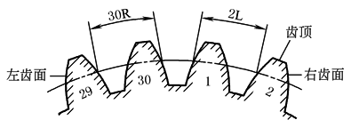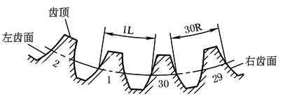 图1 外齿轮的标记和编号 30R—第30齿距,右齿面;2L—第2齿距,左齿面