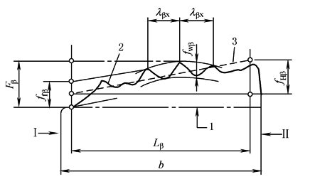 图4 轮齿的鼓度Cβ 轮齿鼓度Cβ的评定步骤,与表齿廓凸度Cα中阐述的齿廓凸度Cα是类似的 波度 波度是螺旋线形状偏差,具有不变的波长和基本不变的高度,切齿机床传动链元件的扰动是导致出现波度通常的主要原因,特别是: ① 刀架进给丝杠的扰动; ② 分度蜗杆传动中蜗杆的扰动 由于原因①所造成的波度的波长,在沿螺旋线方向测量时,等于进给丝杠的螺距除以cosβ 由于原因②所造成的波度,其波长为