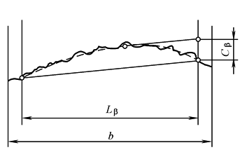 按定义,螺旋线偏差是在端面基圆切线方向测量的实际螺旋线与设计螺旋线之间的差值,如果偏差是在齿面的法向测量,则应除以cosβb,以换算成端面的偏差量,然后才能与公差极限值比较 螺旋线图 螺旋线图包括螺旋线迹线,它是由螺旋线检验设备在纸上或其他适当的介质上画出来的曲线,此曲线如偏离了直线,其偏离量即表示实际的螺旋线与不修形螺旋线的偏差 设计者所采用的螺旋线修形,也表现为同直线的偏离,但这种情况不能作为“设计螺旋线”的偏差来对待 有时迹线长度放大来表示较小齿宽,或缩小表示较大的齿宽 关于右和左螺旋线,可分别用字母“r”、“l”作为标记或下标 在图1一个典型的螺旋线图例子中,可看到设计螺旋线未修形时齿面的螺旋线偏差,如果“设计螺旋线”是鼓形,齿端减薄或别的修形时,则其迹线应为适当形状的曲线 有关螺旋线迹线的详细术语、定义和概念,已在ISO 1328第1部分中叙述 螺旋线计值范围Lβ等于迹线长度两端各减去5%的迹线长度,但减去量不超过1个模数(1×m),所以要提出此减去量是为了有些机加工的条件所引起的,非有意的少量端部减薄不计入偏差量的评定中去,在评定螺旋线总偏差(Fβ)和螺旋线形状偏差(ffβ)时,若在5%区域内有多余的材料,则增加的偏差必须考虑进去,而在这区域内如多切去金属而形成的偏差值,其公差可予增大