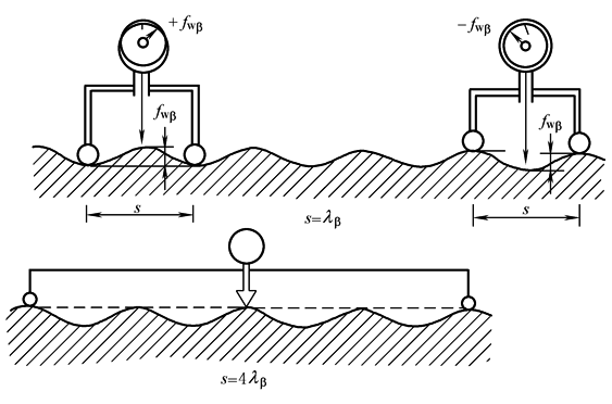 图5 波度曲线检测原理 在检测原因①或②造成的波度曲线时,计算出相关的波长,把附件的球形定位脚放在奇数个波长的间距上,随后使定位脚沿螺旋线滑动,波度的数值由位于定位脚中间的测头显示出来 图中可看到,当测头接触波峰而后又接触波谷时,就如图显示的那样,测头的位移等于两倍波高,这个特点提高了仪器的灵敏度,测量结果以图的形式绘制出来 需要注意的是,若定位脚的间距为偶数个波长时(图5 s=4λβ),波度就显示不出来了 |