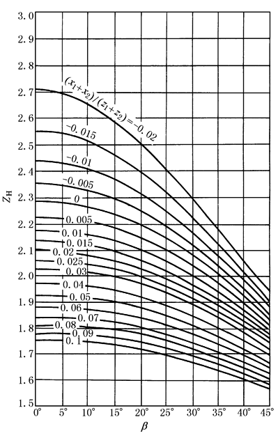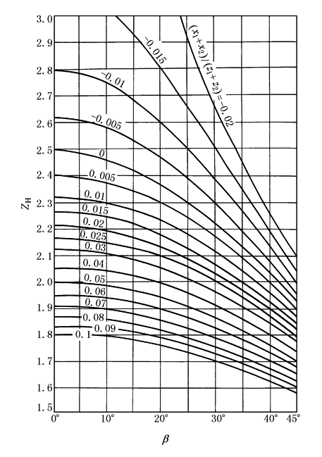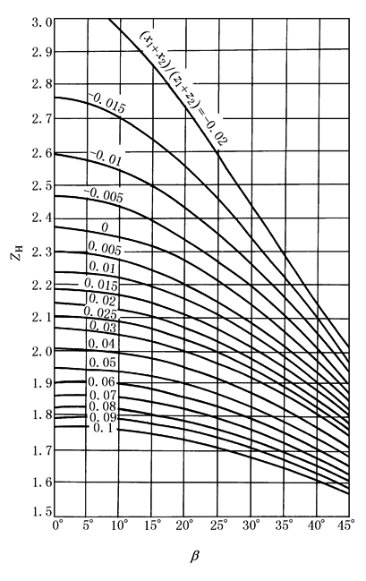 对于法面齿形角αn为20°、22.5°、25°的内、外啮合齿轮,ZH也可由图1、图2和图3根据(x1+x2)/(z1+z2)及螺旋角β查得