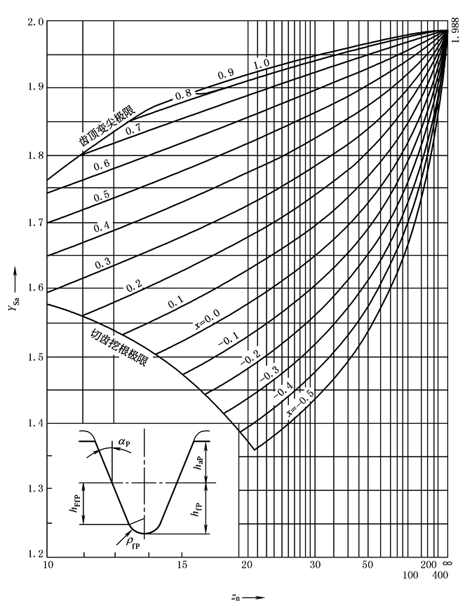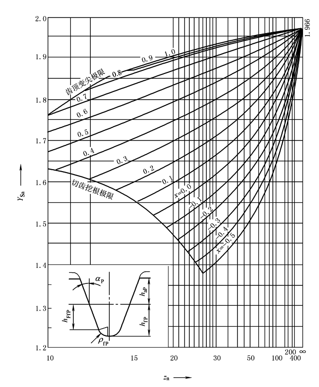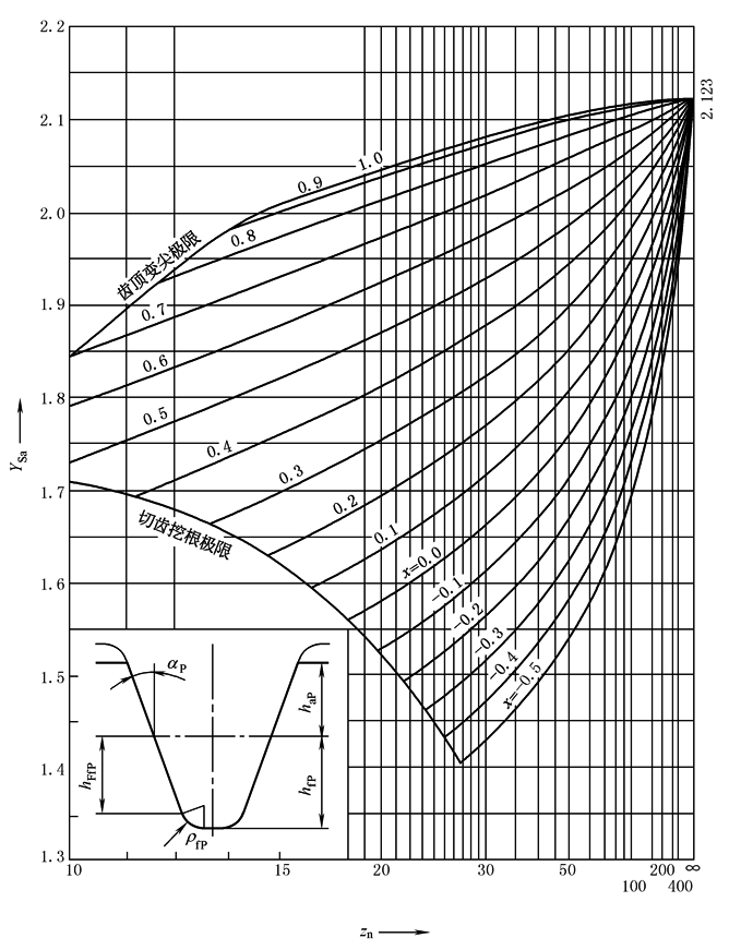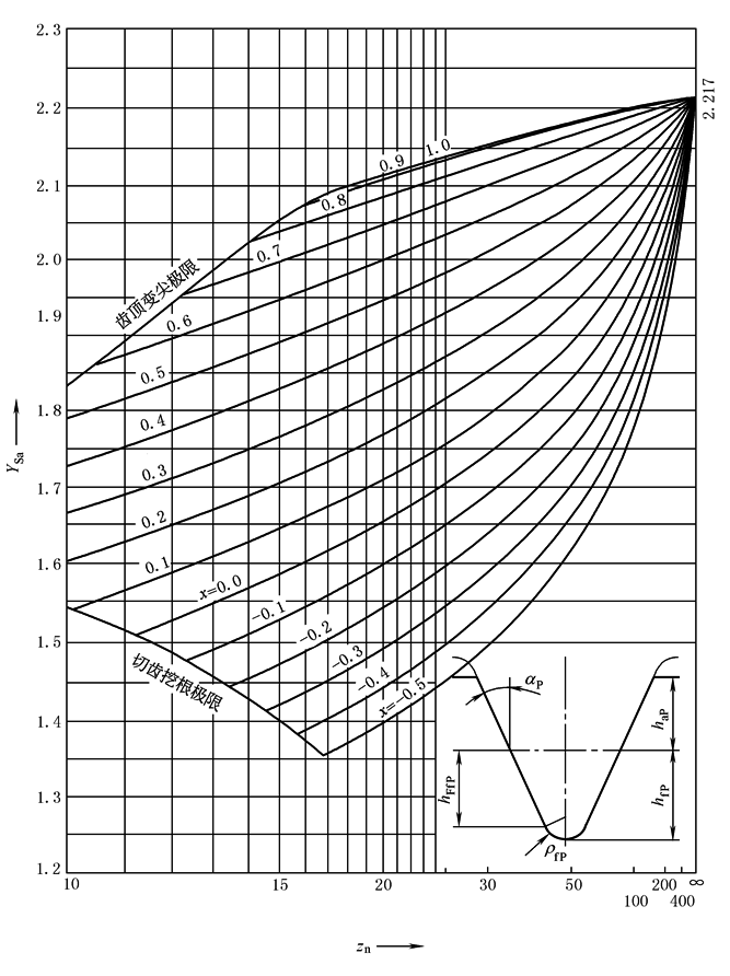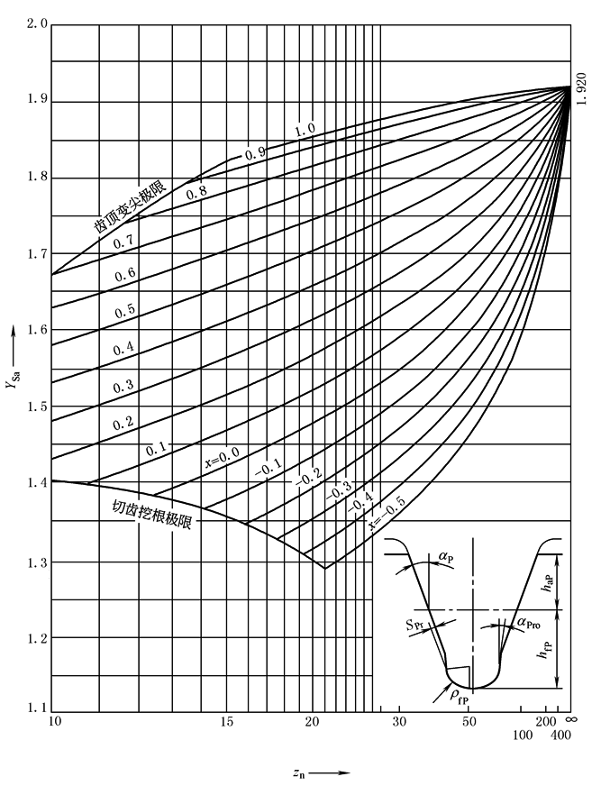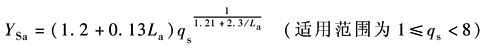 ρF——30°切线切点处曲率半径,外齿轮由表齿廓系数YF、YFa中表1中序号8公式计算,内齿轮由表齿廓系数YF、YFa表2中序号5的公式计算 YS不宜用图解法确定 ② 应力修正系数YSa 应力修正系数YSa仅能与齿廓系数YFa联用,并且只能用于εαn<2的齿轮传动 对于齿廓角αn为20°的齿轮,YSa可按下式计算。对于其他齿廓角的齿轮,可按此式近似计算YSa