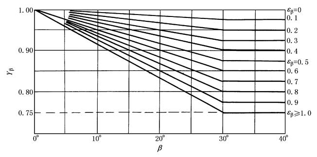 上面式中:当εβ>1时,按εβ=1计算,当Yβ<0.75时,取Yβ=0.75;当β>30°时,按β=30°计值 螺旋角系数Yβ也可根据β角和纵向重合度εβ由下图查取