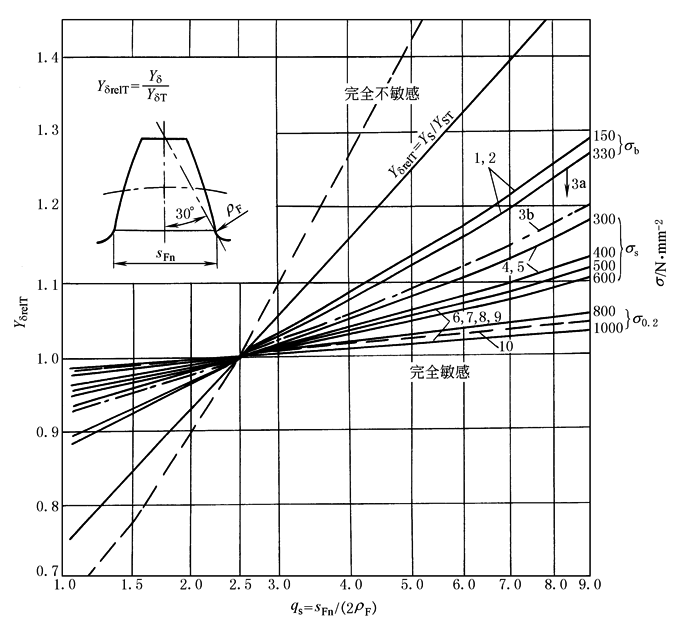 ③ 有限寿命的齿根圆角敏感系数YδrelT 有限寿命的YδrelT可用线性插入法从持久寿命的YδrelT和静强度的YδrelT之间得到