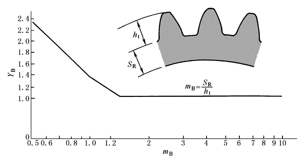 式中 YB——轮缘系数,其他符号同前 轮缘系数YB可按以下各式计算或由下图查取 当mB<1.0时