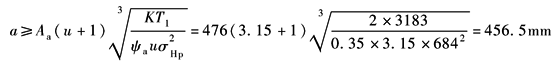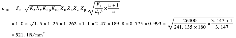 10) 小齿轮、大齿轮的单对齿啮合系数ZB、ZD 按表小轮及大轮单对齿啮合系数ZB、ZD中表的判定条件,由于εβ=1.315>1.0,取ZB=1,ZD=1 11) 计算接触应力σH 由表齿面接触强度核算的公式中表公式可得