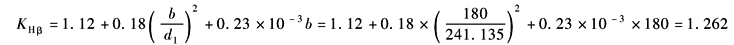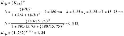 SH1、SH2均达到表最小安全系数中表规定的较高可靠度时,最小安全系数SHmin=1.25~1.30的要求。齿面接触强度核算通过 (4) 轮齿弯曲强度核算 1) 螺旋线载荷分布系数KFβ