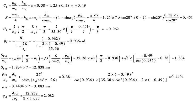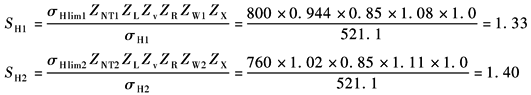 SF1、SF2均达到表最小安全系数中表规定的较高可靠度时最小安全系数SFmin=1.6的要求。轮齿弯曲强度核算通过 |