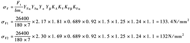 6) 螺旋角系数Yβ 由表弯曲强度计算的螺旋角系数Yβ中图 根据β、εβ查得 Yβ=0.92 7) 计算齿根应力σF 因εα=1.667<2,用表轮齿弯曲强度核算的公式中方法二