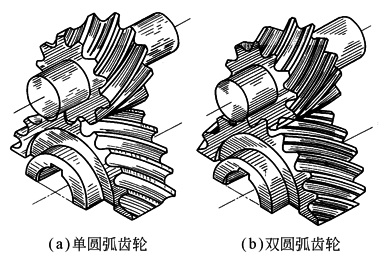圆弧圆柱齿轮简称圆弧齿轮,因其轮齿工作齿廓曲线为圆弧而得名。在国际上称为Wildhaber-Novikov齿轮,简称W-N齿轮 圆弧齿轮分为单圆弧齿轮和双圆弧齿轮,其基本齿廓分别见表圆弧齿轮的滚刀齿形图和表双圆弧齿轮的基本齿廓图。单圆弧齿轮轮齿的工作齿廓曲线为一段圆弧。相啮合的一对齿轮副,一个齿轮的轮齿制成凸齿,配对的另一个齿轮的轮齿制成凹齿,凸齿的工作齿廓在节圆柱以外,凹齿的工作齿廓在节圆柱以内。为了不降低小齿轮的强度和刚度,通常把配对的小齿轮制成凸齿,大齿轮制成凹齿 双圆弧齿轮轮齿的工作齿廓曲线为两段圆弧。在一个轮齿上,节圆柱以外的齿廓为凸圆弧(凸齿)、节圆柱以内的齿廓为凹圆弧(凹齿),凸凹圆弧之间用一段过渡圆弧连接(也可用切线连接),形成台阶,称为分阶式双圆弧齿轮。两个配对齿轮的齿廓相同 圆弧齿轮传动分为单圆弧齿轮传动和双圆弧齿轮传动(图1)。以端面圆弧齿廓啮合传动为例,说明圆弧齿轮和渐开线齿轮啮合传动时的本质区别。圆弧齿轮啮合时,在端面上为凸凹圆弧曲线接触,当凸圆弧和凹圆弧的半径相等时,齿面上的接触迹线为沿齿高分布的一段圆弧线,连续啮合传动,这条圆弧接触迹线由啮入端沿齿向线移动到啮出端。渐开线直齿轮啮合时,在端面上为凸凸曲线接触,齿面上的接触迹线为沿齿宽(轴向)分布的一条直线,连续啮合传动,这条接触迹线从齿根(主动轮啮入)移动到齿顶(主动轮啮出)