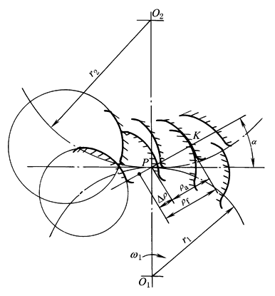 图1 圆弧齿轮传动 要在制造装配上实现圆弧齿轮沿齿高方向的线接触,那是很难的,它要求啮合凸凹齿廓圆弧半径相等且圆心在节点上,无误差加工,无误差装配。实际上圆弧齿轮齿廓设计要求,凸弧齿廓半径略小于凹弧齿廓半径,凸凹弧圆心分布在节线两侧(称为双偏共轭齿廓,如果凸弧圆心在节线上称为单偏共轭齿廓),这就给制造装配带来极大的方便。由于凸凹圆弧齿廓有半径差,端面圆弧齿廓啮合时,只有两齿廓圆心与节点共线,才在两齿廓内切点接触(图2中K点),并立即分离,而与它相邻的端面齿廓瞬间进入接触,又分离,如此重复实现啮合传动,根据这一特点,圆弧齿轮传动又称为圆弧点啮合齿轮传动。相啮合的两齿面经长期跑合(磨合),凸齿齿廓在接触点处的曲率半径逐渐增大,凹齿齿廓在接触点处的曲率半径逐渐减小,两工作齿面的齿廓曲率半径逐渐趋于相等,两齿廓圆心逐渐趋向节点,就可逐步实现沿齿高方向的线接触,即所谓的线啮合传动(实际上齿面受载变形后是区域接触) 在图2中,K点具有双重性,它是端面两齿廓啮合时的啮合点,又是两齿面的瞬时接触点。作为啮合点,两齿廓在该点的公法线必须通过节点P。啮合点由啮入到啮出在空间沿轴向移动,其轨迹KaKb(图3)称为啮合线。P点也在空间沿轴向移动,其轨迹PaPb(图3)称为节线(即节点连线,不同于齿廓中的节线)。啮合线和节线都是平行于轴线的直线。作为接触点在齿面上留下的轨迹KbKc和KbKc'(图3)分别为两条螺旋线