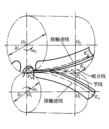 图3 圆弧齿轮的啮合线和齿面接触迹线 当相啮合的两齿轮分别以ω1和ω2回转时,啮合点K以匀速υ0沿啮合线KaKb移动,同时在两齿面上分别形成两条螺旋接触迹线,其螺旋参数分别为