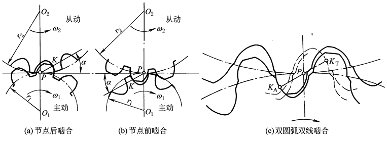 由于β1=β2=β,所以mn1=mn2=mn,即一对相啮合的齿轮的模数必须相等 综上所述,要保证圆弧齿轮能以恒定传动比连续匀速传动,必须使一对啮合齿轮的模数相等、螺旋角相等方向相反、纵向重合度等于或大于1。这就是圆弧齿轮连续啮合传动的三要素 单圆弧齿轮啮合传动,当主动轮是凸齿齿廓时,顺着旋转方向看,主动轮和被动轮齿廓在节点后啮合(接触),称为节点后啮合传动,反之称为节点前啮合传动(图5a、b),单圆弧齿轮传动只有一条啮合线。双圆弧齿轮啮合传动(图5c),既有节点前啮合(图中KA点),又有节点后啮合(图中KT点),有两条啮合线,称为节点前后啮合传动或双啮合线传动。双圆弧齿轮啮合传动时,同一轮齿上的凸凹齿廓都参与啮合,在参数相同条件下,其接触点数比单圆弧齿轮增加一倍,减小了齿面接触应力。另外双圆弧齿轮轮齿根部齿厚较大,提高了抗弯强度。所以双圆弧齿轮有较高的承载能力,已得到广泛应用,正逐步取代单圆弧齿轮传动