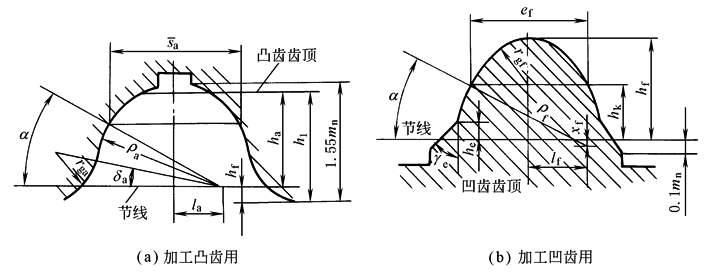 圆弧齿轮的基本齿廓圆弧齿轮的基本齿廓是指基本齿条(或齿条形刀具)在法平面内的齿廓。按基本齿廓标准制成的刀具(如滚刀),用同一种模数的滚刀可以加工不同齿数和不同螺旋角的齿轮。所以,实际使用的圆弧齿轮都是法面圆弧齿轮,法面圆弧齿轮传动的基本原理和端面圆弧齿轮相同,但加工方便 JB 929—1967规定了单圆弧齿轮滚刀法面齿形的标准。滚刀法面齿形及其参数见下表