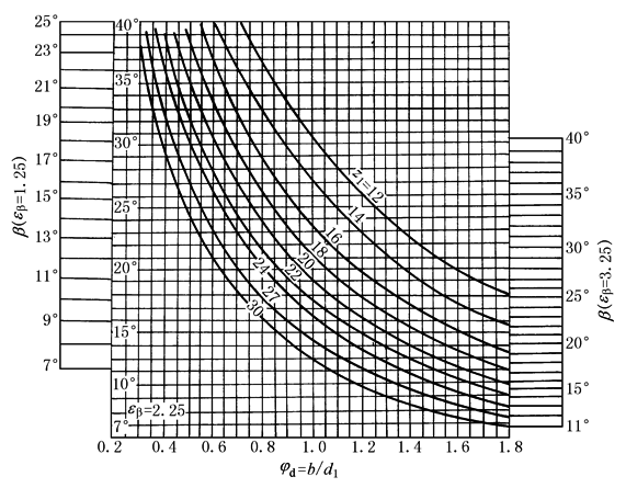 设计时可先确定齿宽系数,再用式(1)来调整 z1、β和εβ。也可先确定 z1、β和εβ,再用式(1)来校核φa。最好是用计算机程序进行参数优化设计 对于常用的εβ值:εβ=1.25;εβ=2.25;εβ=3.25等,可用下图来选取一组合适的φd、z1和β值