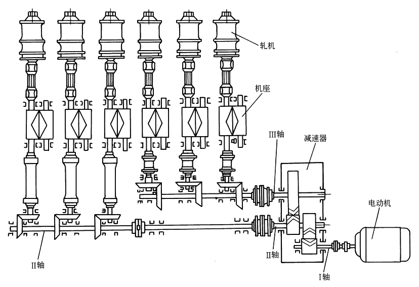例2 某钢铁公司初轧连轧机主传动双圆弧齿轮减速器齿轮强度校核计算。该减速器电机驱动功率P=4000kW,转速248r/min,单向运转。第一级中心距a1=1175mm,速比i1=1.8。第二级中心距a2=1617mm,速比i2=2.2。采用外循环喷油润滑,油品为220号极压工业齿轮油。每天24h连续运转,设计寿命为80000h。要求Ⅱ轴和Ⅲ轴双轴输出。有安装连接尺寸要求。原设计为软齿面渐开线齿轮,第一级模数为26mm,第二级模数为30mm。减速器传动简图见下图