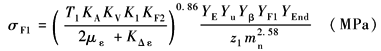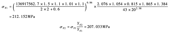 小齿轮材料为37SiMn2MoV,锻件,进行调质处理,齿面硬度260~290HBS;大齿轮材料为ZG35CrMo,铸钢件,进行调质处理,齿面硬度220~250HBS 小齿轮材料的弯曲疲劳极限σFlim1:查表强度计算公式中各参数的确定方法中图10a,得σFlim1=520MPa 小齿轮材料的接触疲劳极限σHlim1:查表强度计算公式中各参数的确定方法中图11a,得σHlim1=840MPa 大齿轮材料的弯曲疲劳极限σFlim2:查表强度计算公式中各参数的确定方法中图10c,得σFlim2=440MPa 大齿轮材料的接触疲劳极限σHlim2:查表强度计算公式中各参数的确定方法中图11c,得σHlim2=680MPa 最小安全系数Smin:按标准推荐值SFmin=1.6,SHmin=1.3 (2) 齿轮强度校核计算 1) 校核轮齿齿根弯曲疲劳强度 按表双圆弧齿轮的强度计算公式中的公式计算齿根弯曲应力: