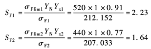 使用系数KA:查表强度计算公式中各参数的确定方法中表2,中等振动,KA=1.5 动载系数KV:查表强度计算公式中各参数的确定方法中图1,按7级精度,v=7.36m/s,得KV=1.1 接触迹间载荷分配系数K1:查表强度计算公式中各参数的确定方法中图2,按软齿面,非对称布置(轴刚性较大), K1=1.01 接触迹内载荷分布系数KF2:查表强度计算公式中各参数的确定方法中表3,7级精度,KF2=1.1 接触迹系数KΔε:查表强度计算公式中各参数的确定方法中图3a,Δε=0.53,得KΔε=0.6 弹性系数YE:查表强度计算公式中各参数的确定方法中表4,锻钢-铸钢,得YE=2.076 齿数比系数Yu:查表强度计算公式中各参数的确定方法中图4a,或按式 螺旋角系数Yβ:查表强度计算公式中各参数的确定方法中图5a,或按式(sin2βcosβ)0.14=Yβ计算,得Yβ=0.815 齿形系数YF:查表强度计算公式中各参数的确定方法中图6a,按当量齿数zv1=69.177,zv2=152.83得YF1=1.865,YF2=1.82 齿端系数YEnd:查表强度计算公式中各参数的确定方法中图7a,用插值法,εβ=2.53查取,β=30°时YEnd=1.35,β=35°时YEnd=1.47,当β=31°24' 47"时YEnd=1.384 将上列各参数值代入弯曲应力计算公式得: