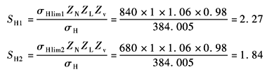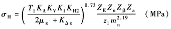 式中T1、KA、KV、K1、με、KΔε等同弯曲应力计算中的值,其余参数如下 接触迹内载荷分布系数KH2:查表强度计算公式中各参数的确定方法表3,按7级精度得KH2=1.39 弹性系数ZE:查表强度计算公式中各参数的确定方法中表4,锻钢-铸钢,得ZE=31.263 齿数比系数Zu:查表强度计算公式中各参数的确定方法中图4a,或按式 螺旋角系数Zβ:查表强度计算公式中各参数的确定方法中图5a,或按式(sin2βcosβ)=Zβ计算得Zβ=0.674 接触弧长系数Za:查表强度计算公式中各参数的确定方法中图9a,按当量齿数Zv1=69.177,Zv2=152.83,得Za1=0.954,Za2=0.945。