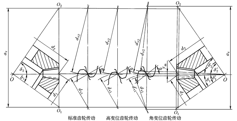 图3 直齿锥齿轮的切向变位 (3) 高-切综合变位 切向变位和高变位常常一起使用,称为高-切综合变位。它不仅可以改善传动性能、均衡大小齿轮的强度,而且还可以改善由于高变位所引起的小齿轮齿顶厚度过薄的现象 (4) 非零综合变位 一种新型锥齿轮,其综合变位之和为正或负值:xS+0.5xtStanα≠0 |