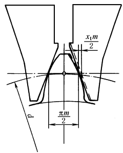 图2 标准齿轮和径向变位齿轮的啮合情况 (2) 切向变位 用范成法加工锥齿轮时,当加工轮齿两侧的两刀刃在其所构成的产形齿轮的分度面上的距离为πm/2时,加工出来的齿轮为标准齿轮;若改变两刀刃之间的距离,则加工出来的齿轮为切向变位齿轮,变位量用xtm表示(m为模数,xt称为切向变位系数)。变位使齿厚增加时,xt为正值;反之xt为负值。为均衡大小齿轮的弯曲强度,常采用xtS=xt1+xt2=0的切向变位,此时除齿厚有所变化外,其他参数并不变化(见图3)。若xtS任设值则称为任设值切向变位