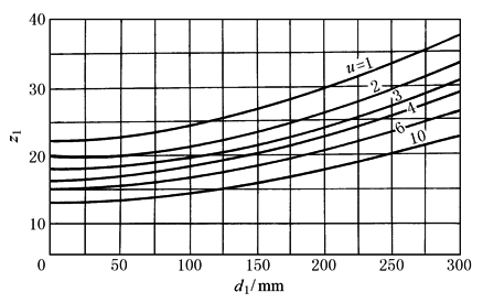 3.选取最少齿数时可参考表锥齿轮的最少齿数zmin和最少齿数和zSmin 4.当分度圆直径确定之后,推荐按图2选取z1 |