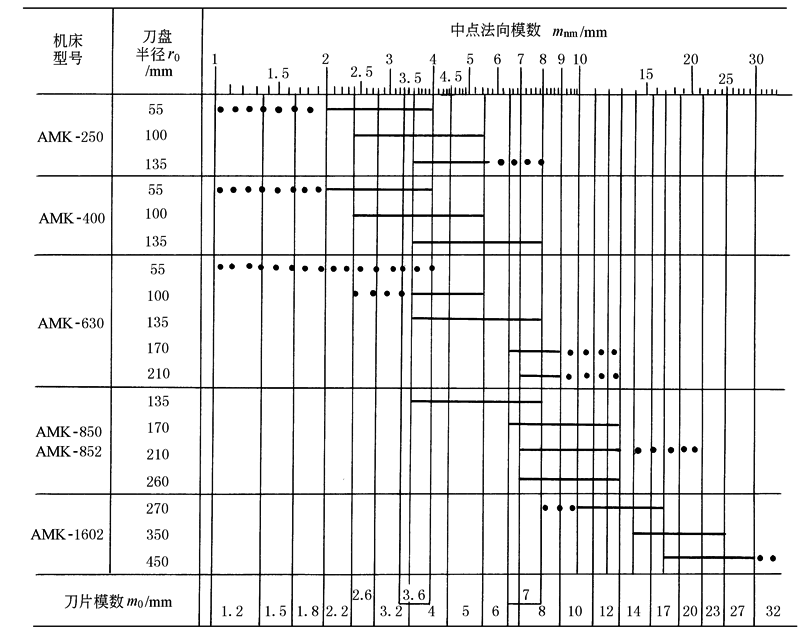 由mnm值和机床型号,查对下图得出刀盘半径r0和刀盘模数m0 |