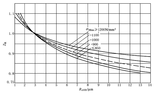 当σHlim<850N/mm2时,取CzR=0.15; 当σHlim>1200N/mm2时,取CzR=0.08; Rz100——相对微观不平度十点高度(相对于av=100mm试验齿轮);