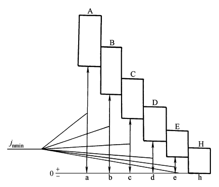 1) 标准规定齿轮副的最小法向侧隙种类为6种:a、b、c、d、e和h。最小法向侧隙值以a为最大,h为零(如下图所示)。最小法向侧隙种类与精度等级无关 2) 最小法向侧隙种类确定后,按表齿厚上偏差 3) 最小法向侧隙jnmin按表最小法向侧隙jnmin值规定。有特殊要求时,jnmin可不按表最小法向侧隙jnmin值所列 数值确定。此时,用线性插值法由表齿厚上偏差 4) 最大法向侧隙jnmax按 5) 标准规定齿轮副的法向侧隙公差种类为5种:A、B、C、D和H,法向侧隙公差种类与精度等级有关。允许不同种类的法向侧隙公差和最小法向侧隙组合。在一般情况下,推荐法向侧隙公差种类与最小法向侧隙种类的对应关系如下图所示 6) 齿厚公差