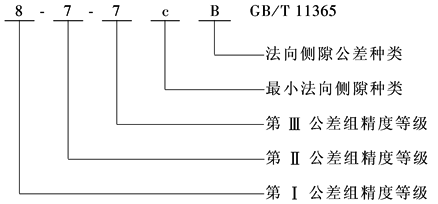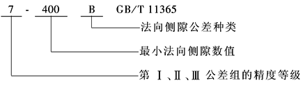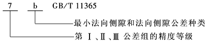 在齿轮工作图上应标注齿轮的精度等级和最小法向侧隙种类及法向侧隙公差种类的数字(字母)代号 标注示例: 齿轮的三个公差组精度同为7级,最小法向侧隙种类为b,法向侧隙公差种类为B: