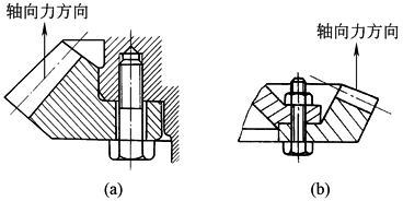 当轴向力朝向锥顶时,为使螺钉不承受拉伸力,应按图示方向连接。图a常用于双支承式结构;图b用于悬臂式支承结构 |