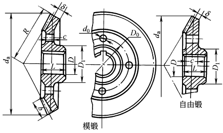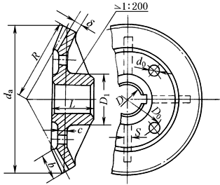 D1=1.6D;L=(1~1.2)D δ=(3~4)m,但不小于10mm c=(0.1~0.17)R,D0、d0按结构确定 |