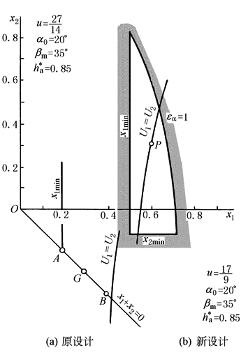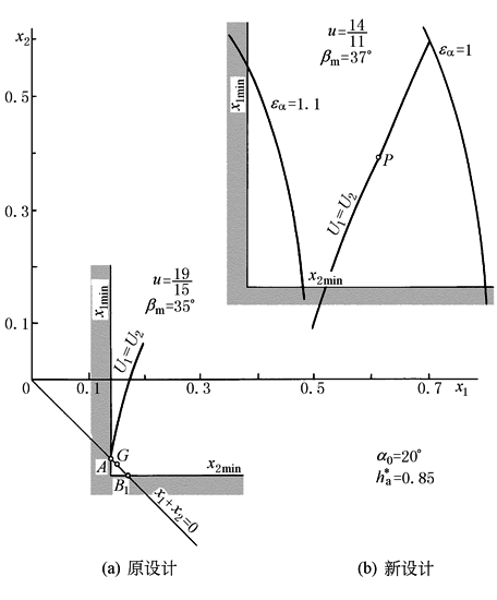 1) 新、原设计都能满足等滑动系数U1≈U2的要求 2) 新、原设计接触强度比大致为: