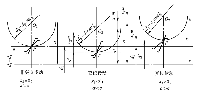 式中 q——蜗杆直径系数,在旧标准中q曾是一个重要参数,但新标准GB/T 10085—1988将d1标准化,因此q不再是重要的自变量 作动力传动时,为提高传动效率,γ应取得大些,但过大会使蜗杆和蜗轮滚刀的制造增加困难。因此,一般取γ<30°;当传动要求具有自锁性能时,应使γ≤ρ'(ρ'—当量摩擦角,参考有关资料),当采用滑动轴承时,一般取γ≤6°,当采用滚动轴承时,一般取γ≤5°,但这时的传动效率较低 表蜗杆的基本尺寸和参数列出蜗杆的基本尺寸和参数供设计参考,该表适用于ZA、ZI、ZN和ZK蜗杆 变位系数x2 圆柱蜗杆传动变位的主要目的是配凑中心距。此外,通过变位还可以提高承载能力和效率,消除蜗轮轮齿根切现象。根据使用要求,还可以改变接触线的位置使之有利于润滑 蜗杆传动的变位方法与渐开线圆柱齿轮相似,即利用改变切齿时刀具与轮坯的径向位置来实现变位。在蜗杆传动的中间平面中,其啮合状况相当于齿轮齿条传动,因此蜗杆不变位,其尺寸也不改变,只是蜗轮变位,变位后蜗轮的节圆仍然与分度圆重合,而蜗杆的节圆不再与分度圆重合。图2为几种变位情况,a'为变位后的中心距,a是变位前的中心距 变位系数x2过大会使蜗轮齿顶变尖,过小会使蜗轮轮齿根切。对普通圆柱蜗杆传动,一般取-1≤x2≤1
