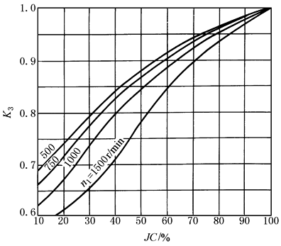 图4 小时载荷率系数K3 注:1. 2.小时载荷率以每小时工作最长时间计算。 3.当JC<15%时,按15%计算。 4.连续工作1h,取JC=100%。 5.转向频繁交替时,取工作时间之和。
