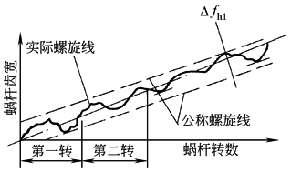 在蜗杆轮齿的工作齿宽范围内(两端不完整齿部分除外),蜗杆分度圆环面上包容实际螺旋线的最近两条公称螺旋线间的法向距离 |