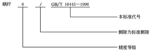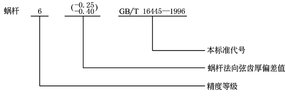 在蜗杆、蜗轮工作图上,应分别标注其精度等级、侧隙代号或法向弦齿厚偏差和本标准代号标注示例: 1) 蜗杆精度等级为6级,法向弦齿厚公差为标准值,侧隙取标准侧隙,则标注为