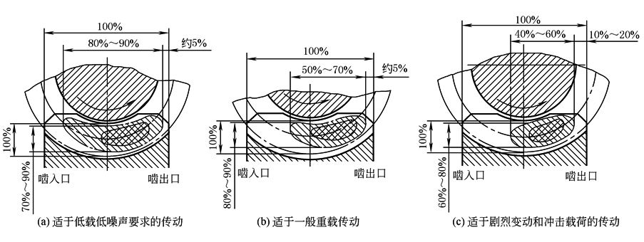 最简单而常用的检查承载能力和运转状态的主要方法是:对于在传动装置中配啮的蜗杆和蜗轮用着色法,检查在轻载下旋转一周之后蜗轮齿面上的接触斑点,对接触斑点所希望的大小和位置见图1所示