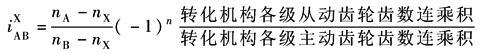 和 上列式(1)中,指数n表示外啮合齿数。式(1)~式(3)中,nA、nB、nC分别代表行星齿轮传动中构件A、B、C的转速 式(2)与式(3)等号左、右分别相加可得