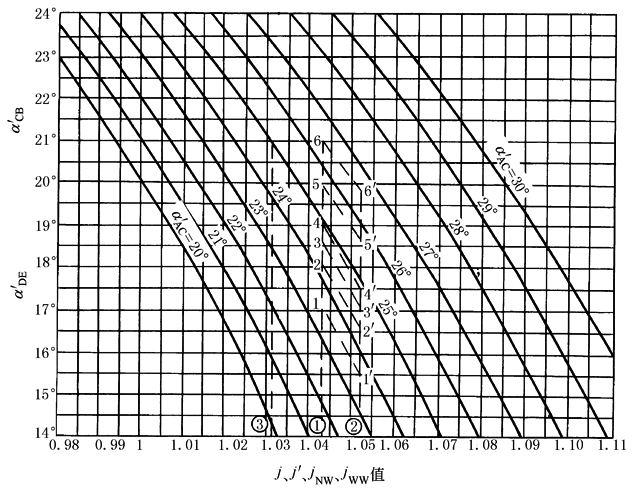 图3 确定NGWN(Ⅱ)型传动啮合角的线图 图1应用示例 例1 求j=1.043的NGW型行星齿轮传动的啮合角α'AC、α'CB 解 在横坐标上取j=1.043之①点,由①点向上引垂线,可在此垂线上取无数点作为α'AC与α'CB的组合,如1点(α'AC=23°30'、α'CB=17°),…,6点(α'AC=26°30'、α'CB=21°)。从中选取比较适用的啮合角组合,如2~5点之间各点 例2 求j=1.043、j'=1.052的NGWN型行星齿轮传动的各啮合角组合 解 先按j值及j'值由①点和②点分别做垂线,①点的垂线上,1,2,…,6的对应点为②点垂线上的1',2',…,6'。从而得啮合角组合,如1—1'(α'AC=23°30'、α'CB=17°、α'DE=15°20')…6—6'(α'AC=26°30'、α'CB=21°、α'DE=19°45')等无数个啮合角组合,从中选取比较合适的啮合角组合,如可选α'AC=26°、α'CB=20°25'、α'DE=19°的啮合角组合 例3 求jNW=1.031的NW型行星齿轮传动的啮合角组合 解 按jNW值在横坐标上找到③点,由③点向上做垂线,从垂线上无数点中选取比较合适的啮合角组合,如α'AC=24°15'、α'DE=20°的一点 图2应用示例 已知:一对齿轮,齿数z1=21,z2=33,模数m=2.5mm,中心距a'=70mm。确定其变位系数 解 1) 根据确定的中心距a' 求啮合角α'