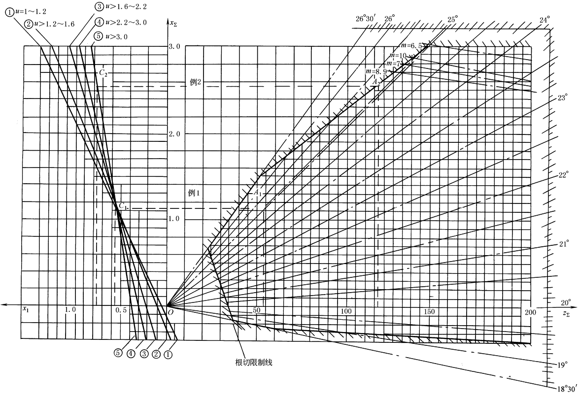 2) 图2中,由O点按α'=25°01'25"作射线,与zS=z1+z2=21+33=54处向上引垂线,相交于A1点,A1点纵坐标即为所求总变位系数xΣ(见图中例,xΣ=1.12)。A1点在线图许用区内,故可用 xΣ也可根据α' 按无侧隙啮合方程式 3) 根据齿数比 |