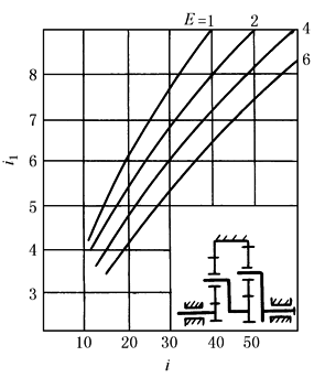 多级行星齿轮传动各级传动比的分配原则是获得各级传动的等强度和最小的外形尺寸。在两级NGW型行星齿轮传动中,欲得到最小的传动径向尺寸,可使低速级内齿轮分度圆直径dBⅡ与高速级内齿轮分度圆直径dBⅠ之比(dBⅡ/dBⅠ)接近于1。通常使dBⅡ/dBⅠ=1~1.2 NGW型两级行星齿轮传动的传动比可利用下图进行分配(图中i1和i分别为高速级及总的传动比)先按下式计算数值E,而后根据总传动比i和算出的E值查线图确定高速级传动比iⅠ后,低速级传动比iⅡ由式iⅡ=i/iⅠ求得 E=AB3 |