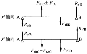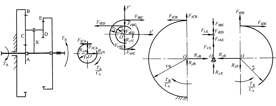 注:1.表中公式适用于A轮输入、B轮固定、E轮输出、行星轮数目Cs≥2的直齿或人字齿轮行星传动。NGWN(Ⅱ)型传动为行星轮齿数ZC=ZD时的一种特殊情况。 2.式中αn为法向压力角,β为分度圆上的螺旋角,各公式未计入效率的影响。 3. 4.转矩单位为N·m;长度单位为mm;力的单位为N。 |