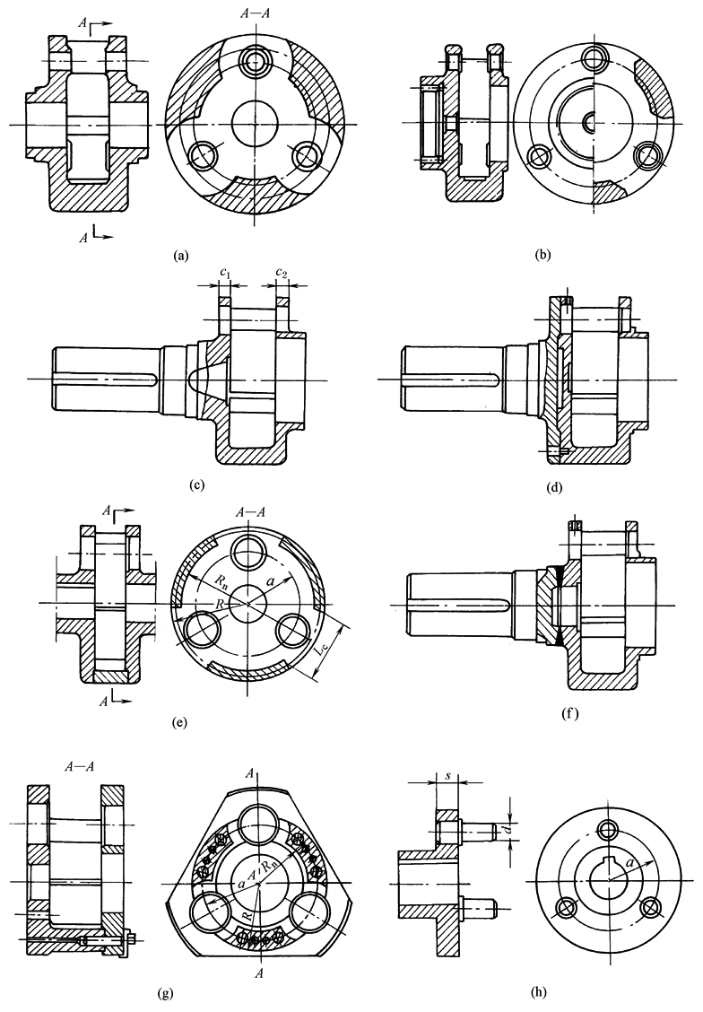 行星架结构 双壁剖分式行星架较整体式行星架结构复杂,主要用于高速行星传动和传动比较小的低速行星传动。例如传动比 双壁整体式和双壁剖分式行星架的两个侧板通过中间连接板(梁)连接在一起。两个侧板的厚度,当不安装轴承时可按经验公式选取:c1=(0.25~0.30)a,c2=(0.20~0.25)a。开口长度Lc应比行星轮外径大10mm以上。连接板内圆半径Rn按下式确定:Rn=(0.85~0.50)R(参看上图e和上图g) 单壁式行星架结构简单,装配方便,轴向尺寸小(见上图h),但因行星轮轴呈悬臂状态,受力情况不好,刚性差,并需校核行星轮轴与行星架孔的配合长度及过盈量,而且轴承必须安装在行星轮孔内,特别是当行星轮直径较小时比较困难,故一般只用于中小功率 传动。行星架壁厚s推荐取值为 装配。配合长度,即壁厚s可在(1.5~2.5)d范围内选取,并兼顾上述对壁厚的推荐取值 |