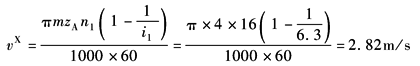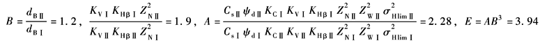 根据表行星轮数目与传动比范围中表得之知,单级传动比最大为13.7,故该NGW型行星齿轮减速器须采用二级行星传动 (2) 分配传动比 先按式E=AB3计算出数值E,而后利用表多级行星齿轮传动的传动比分配中图分配传动比 用角标Ⅰ表示高速级参数,Ⅱ表示低速级参数。设高速级与低速级齿轮材料及齿面硬度相同,即σHlimⅠ=σHlimⅡ 取行星轮个数CsⅠ=CsⅡ,齿面硬化系数ZWⅠ=ZWⅡ,载荷分布系数KCⅠ=KCⅡ,齿宽系数比 根据i=31.25,E=3.94查表多级行星齿轮传动的传动比分配中图得iⅠ=6.2,而iⅡ=i/iⅠ=31.25/6.2≈5 (3) 高速级计算 1) 确定齿数 为提高设计效率,一般不必自行配齿,只须首先将分配的传动比适当调整即可直接查表确定齿数。查表NGW型传动的配齿方法及齿数组合表中表,可知本题中只需将iⅠ=6.2调整为6.3,iⅡ=5不变即可。这样总传动比误差仅为0.8%,远小于一般减速器实际传动比允许的误差4%,完全符合要求 查表行星轮数目与传动比范围中表,取Cs=3,而后查表NGW型传动的配齿方法及齿数组合表中表,在i=6.3,Cs=3一栏中选取齿数组合:zA=16,zC=35,zB=86,i=6.375 2) 按接触强度初算A-C传动中心距和模数 输入转矩 设载荷不均匀系数KC=1.15; 在一对A-C传动中,小轮(太阳轮)传递的转矩为