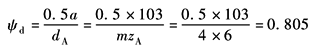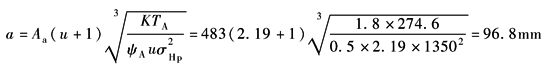 太阳轮和行星轮的材料选用20CrMnTi渗碳淬火,齿面硬度要求为:太阳轮59~63HRC,行星轮53~58HRC;σHlim=1500MPa;许用接触应力σHp=0.9σHlim=1500×0.9=1350MPa 取齿宽系数ψa=0.5,载荷系数K=1.8,按表齿面接触强度计算公式计算中心距