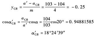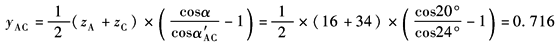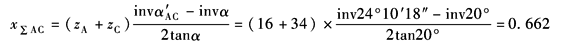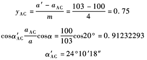 则中心距a'=aAC+yACm=100+0.716×4=102.86mm 取实际中心距为:a'=103mm 3) 计算A-C传动的实际中心距变动系数yAC和啮合角α'AC ∴ 4) 计算A-C传动的变位系数
