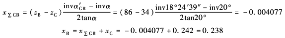 用表变位方式及变位系数的选择中图2校核,z∑AC=16+34=50和x∑AC=0.662均在许用区内,可用 根据x∑AC=0.662,实际的u=34/16=2.13,在表变位方式及变位系数的选择中图2中,x∑纵坐标上0.662处向左作水平直线与③号斜线(u>1.6~2.2)相交,其交点向下作垂直线,与x1横坐标的交点即为太阳轮的变位系数xA=0.42,行星轮的变位系数为:xC=x∑AC-xA=0.662-0.42=0.242 5) 计算C-B传动的中心距变动系数yCB和啮合角α'CB C-B传动未变位时的中心距为: ∴ 6) 计算C-B传动的变位系数
