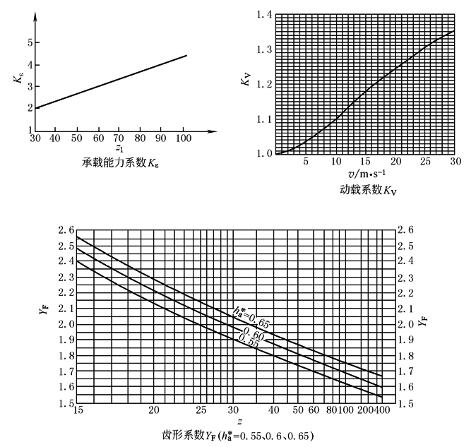 渐开线少齿差内齿轮副受力后是多齿接触,实测实际接触齿数为3~9。作用于一个齿的最大载荷不超过总载荷的40%~50%;作用于齿顶的载荷仅为总载荷的25%~30%。齿轮强度计算可将其载荷除以承载能力系数Kε后采用表轮齿弯曲强度核算公式计算,且只需计算弯曲强度。Kε可以近似地由本表中线图查取(其中z为齿数) 齿轮也可按下列简化公式验算其轮齿弯曲强度或确定其模数