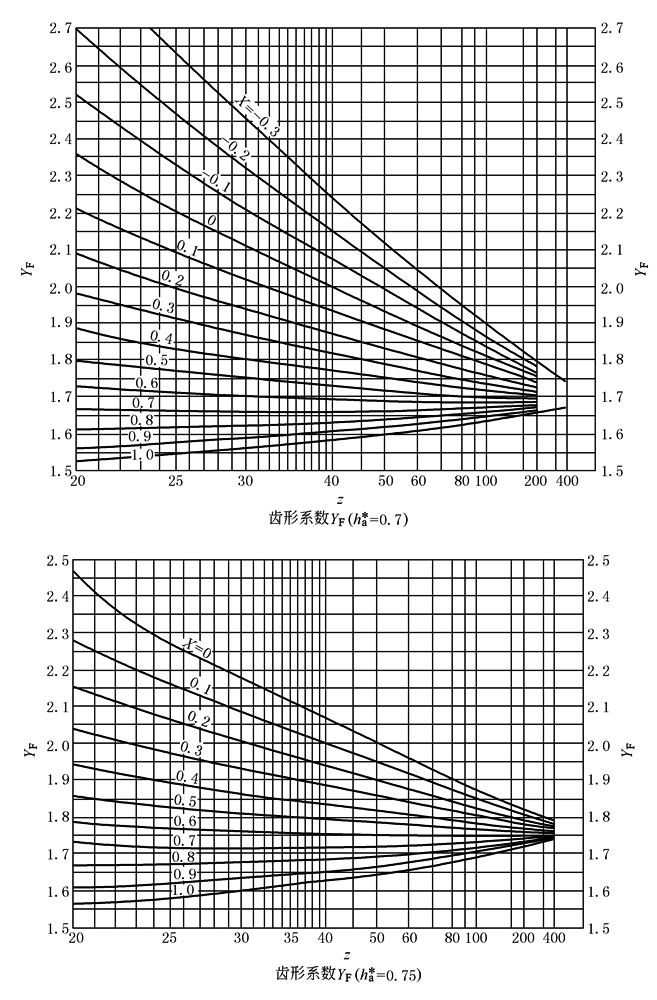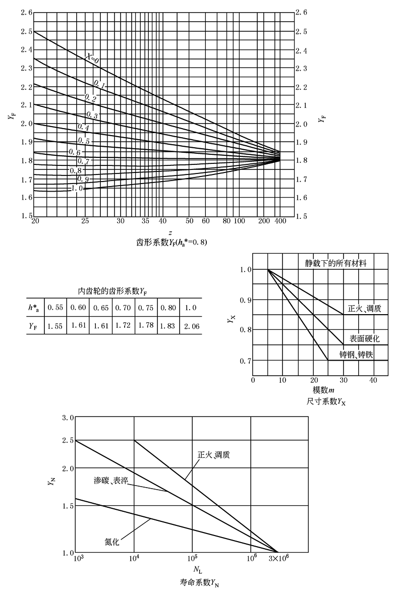 σF——外齿轮或内齿轮的齿根弯曲应力,MPa Ft——齿轮分度圆上的圆周力,N T1——外齿轮传递的转矩,N·mm b——齿宽,mm m——模数,mm KA——使用系数,按表使用系数KA中表1查取 KV——动载系数,按本表中线图查取 YF——齿轮的齿形系数:当其顶圆直径符合计算式da2=d2-2m(ha※-x2)或选用表一齿差内齿轮副几何尺寸及参数、表二齿差内齿轮副几何尺寸及参数、表三齿差内齿轮副几何尺寸及参数、表四齿差内齿轮副几何尺寸及参数中组合齿轮参数时,可由本表中查取 σFp——许用弯曲应力,MPa σFlim——试验齿轮的弯曲极限应力,MPa YX——与弯曲应力相关的尺寸系数,查本表线图 YN——与齿根弯曲应力相关的寿命系数,查本表线图 ψd——齿宽系数,此外取ψd=0.1~0.2 z——齿数 |